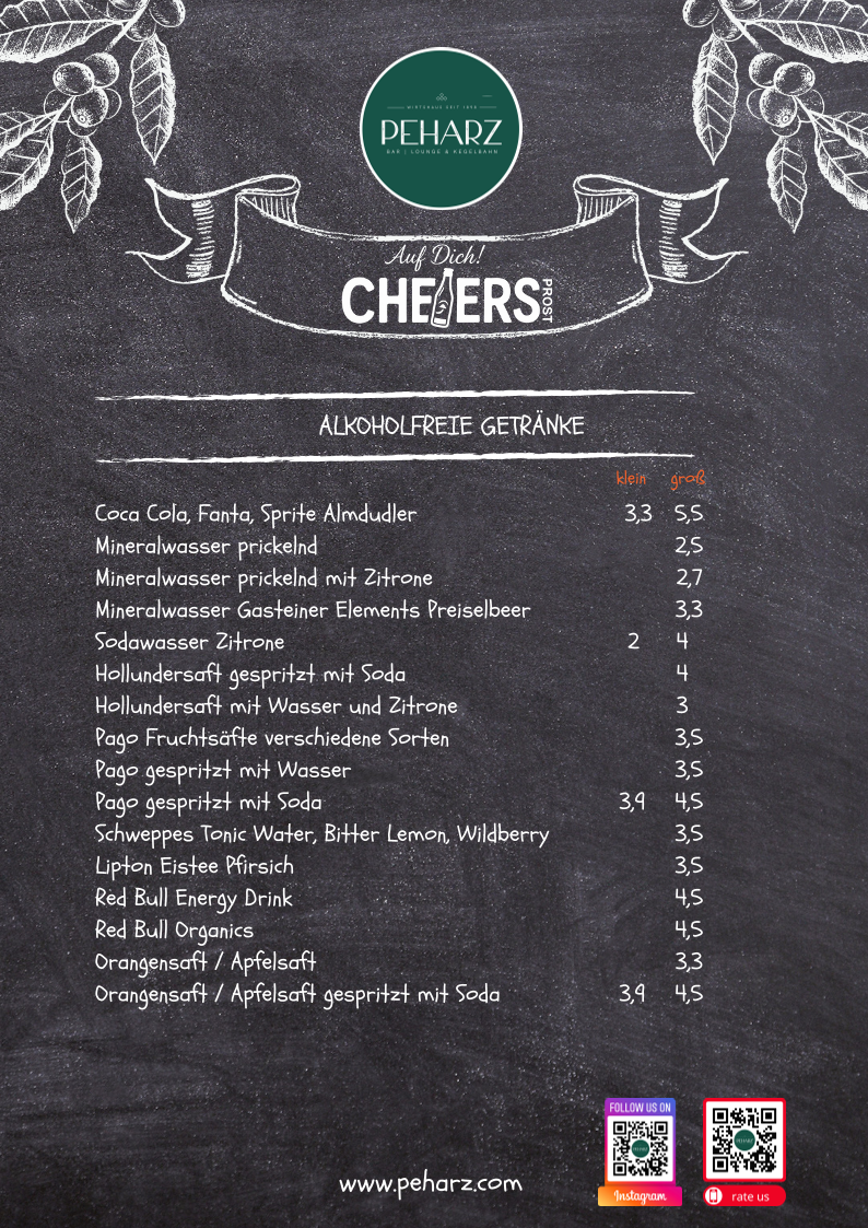 The highlight of the menu lies in the enticing cocktails, with the Mojito and Pina Colada standing out at €7.50. Each drink is carefully crafted to ensure a perfect balance of flavor, making it an ideal spot for a casual night out or a celebratory gathering. Overall, Peharz Bar Lounge Kegelbahn not only serves drinks but creates an inviting atmosphere that keeps patrons coming back.